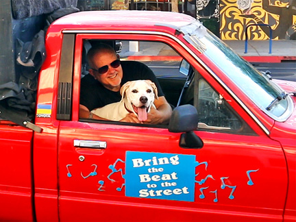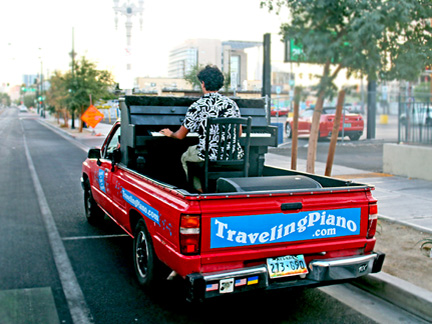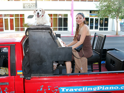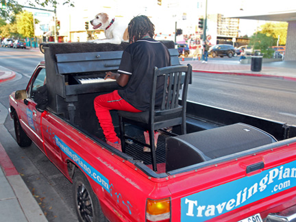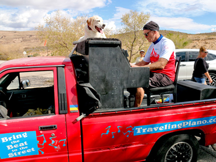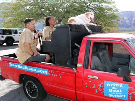 I took the Traveling Piano out to the corner of Las Vegas and Charleston Boulevards today. While creating music I could not help but compare the sound to the acoustic piano's on the streets that I put out. Even though they are completely out of tune they are so much more alive. My favorite thing happened. Strangers coming together to get onto the piano and create some music for the first time. One guy was from Reno the other from upstate New York who was a songwriter in town with a show doing sound. Mo fell off the piano twice. One to the inside the other onto the cab roof while trying to turn around on top. His days of walking back and forth on top of the piano are over. His back legs will no longer support that. It must be ver frustrating for him in being stuck in one position once he's up there. He still wants to go up.