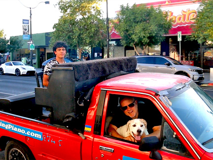 I met a young piano player with a street piano about two weeks ago and he played the star wars theme while I thought how great that would sound and present itself on the Traveling Piano as I drove him down the street. I suggested he get in touch with me and he did. We planned for today and he brought two friends with him who were going to sit in the back of the truck but they chickened out at the last minute. So we all separated and I did my thing with the young piano man named Andrew. It was really out of the box for him, it has to be for everyone. Playing the piano loud while someone is driving you down the street... ha, been doing it myself for almost forty years. Andrew is now in a very small camp of piano players to have done that. I sent him the photos I took. He thanked me but I have no idea if he really liked doing it or not. I mean, I can't imagine it being anything but mind blowing for a young kid but... you never know. Mo sat in the cab with me.
