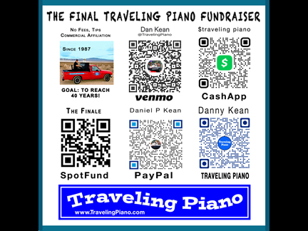 The Traveling Piano's Final Fundraiser Spotfund - Venmo: Dan Kean @TravelingPiano 2156399378 - PayPal Me for the Traveling Piano - CashApp: $travelingpiano - Contribution Page - Email me for snail mail.