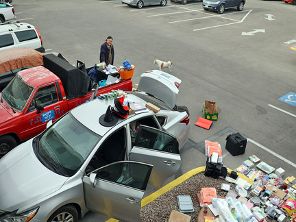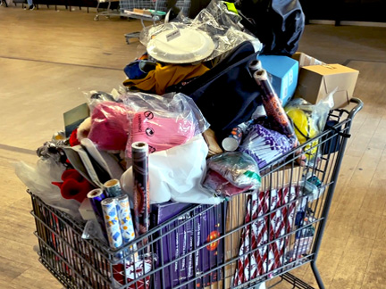 I leaned about an auction house that gets rid of Amazon returns. The place is like a huge warehouse with a $6 section, $3 dollar section and a $1 dollar section of returns that people pick through in and out of boxes. I asked the manager what they do with everything that no one wants. He showed me that they stuff shopping carts with everything and sell them for $15 a cart. I asked if I could get the unwanted stuff for my Christmas Homeless project and he offered for me to go through the bins to collect a shopping carts worth. Wow! What a gold mine... I collected, snack bars, candy, toys, and about $700 worth of other stuff all for $15! That felt very providential as I do not have it in me to push the fundraising hard enough and there is no other resource to get what I need. Now to wrap it all. My friend Eric contributed for the wrapping paper, ribbon and tape. I even found boxes and bags to stuff small trunkets into. A few contributions paid for $300 worth of candy.