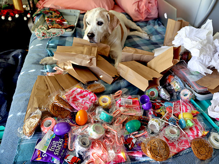 I just need to flow in the moment with it all. The newfound arthritis in my lower back translates into constant pain. That is taking away my strength and so, I tire easily. I am following Mo's lead on the matter. His arthritis is so bad he can barely walk and he just lives through it.I am not going to push myself with energy because I can't. So this will be the twelve days of Christmas and I'll be giving out presents all week until New Years. Want to help support this Christmas for those on the streets? Lastly, my room is a Christmas Wonderland. I have surrounded myself with candles, music, vintage Christmas decorations and Mo while I wrap presents. Merry Christmas!