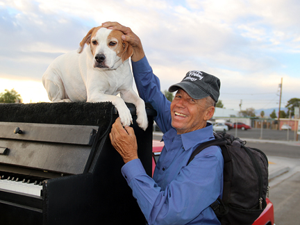 I left for the day and went back the next day to take him out into the woods. Just Mo and I with the Traveling Piano truck. I put him on the top of the piano and then showed him how to get down and then get back up. I thought there is no way he is going to be able to jump up. A friend said, he will jump up. The next day as small as he was, he jumped up into the truck and onto the piano. All I had to do was show him that first time. Then I thought what if he is too big for the piano. He turned out the perfect size with almost the same colors as Bo. I thought, what am I going to do concerning motel stays. He instantly learned to stay very quiet when I snuck him into a room and from day one. I took him outside and said Mo go pee. He did. I said Mo go shit. He did. And, he responded to the commands every day forward when needed.
