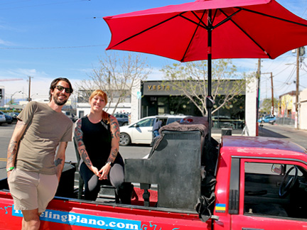 A piano man from Calgary, Canada was visiting Las Vegas and we connected for some Traveling Piano fun. That was a needed and good distraction from the shitty politics happening in my life. He considers himself a rock start and promotes himself as such. He has a musical daddy that supports his travel around the world to do concerts. His playing and singing was certainly powerful enough! I drove him all around Downtown Las Vegas and down the strip playing and singing on the truck. What a blast it was for him! He also is good at construction and helped me build the walls for the gallery to protect everything from the wind.
