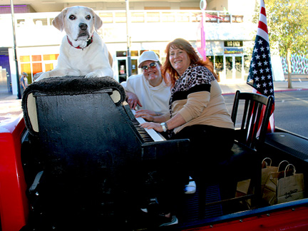 Mo and I took the Traveling Piano out to Main Street in the Downtown Arts District of Las Vegas. Mo cannot stand up or turn around on top of the piano anymore because his back leg joints no longer exist because of old age arthritis. Its difficult for him but he trudges along with my help. People really appreciate what the Traveling Piano has to offer. Its a push for me to keep the pace going with interactions. As far as stamina, I try little tricks to keep going.