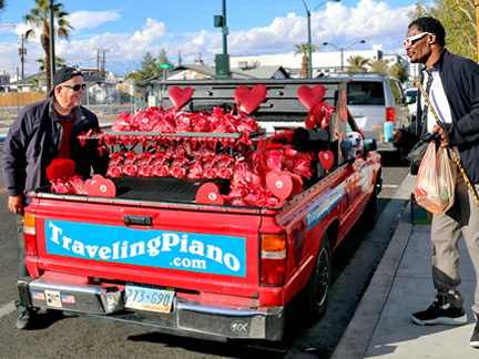 Went onto Main Street in Downtown Las Vegas with the Traveling Piano to create some music. There were too many people around. It would have looked like a "show" and all who know the Traveling Piano's work, they know that is not what I am about. So, on a dead end side street I parked and played while people found us one on one. They were drawn to the truck through the music. Mo hung out inside the cab. He does not care about attention so much anymore with his age. Maybe my mom was with me in spirit because... three people came up during different time periods and two noticed the small Ukrainian flag on the side of the truck.