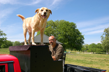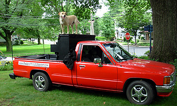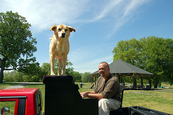 .... I found a perfect spot. I couldn't believe it, two minutes from my house. It is hard to explain but its in a small unused parking lot set back in a small and I mean small patch of woods in a brand new developed area. I am practically hidden from everything backed in and angled out on the corner of the lot. The highway is behind the trees and I'm sure people filling their gas tanks across the street at the station can hear the sound a teeny weenie bit, just enough to drive them crazy trying to figure out if its live music and where it is coming from. They would never figure it out in a million years. Anyone in the new housing development in front of me would need binoculars to really see that it is a dog on top of a truck.