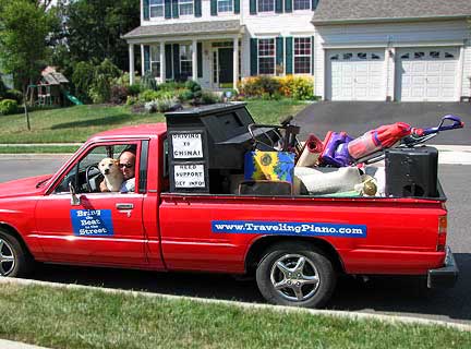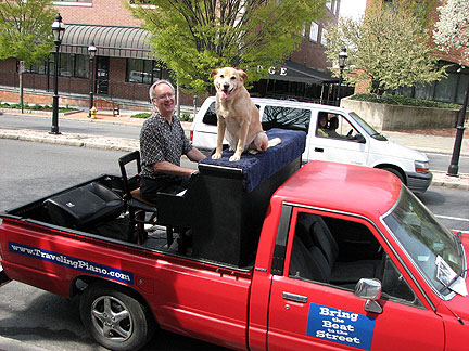 Back to the Traveling Piano truck. With a full belly, Boner being himself, a real champ sitting with his head out the window waiting for me, I said to myself, "It is 11pm on a Sunday night, everything closed down, what are you going to do, just go through the motions one step at a time like you did earlier in the day, don't panic, don't worry, start by putting everything away and get ready to leave." I did that and while finishing inside the cab I said to my dog, "Bo, were going to need some magic here just like earlier in the day." I pulled myself outside the truck cab and a service truck with a yellow blinking light pulls up along side of me. i quickly yelled, "yo, can you give me a jump?" The guy says, "ok" and in less than a minute I was up and running. I asked him if I could return the favor and play some music for him, give him some money... he said, "no problem I need to be on my way." I ran out of New York and back to Pipersville, Pa for the first time. I've been riding the same route from Philadelphia back and forth to NY for 35 years. This was a new experience. It should have taken me an hour and fifteen minutes. It took three hours, after looping on and off the NJ turnpike three times I ended up driving back to Philly and then up to Pipersville. I had no mind to think, it was Pavlov's Dog time. I was one very tired piano man when I got back.