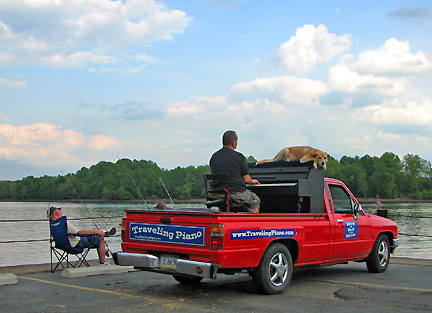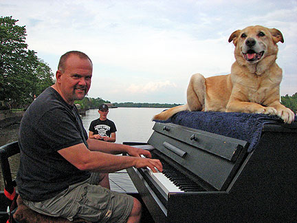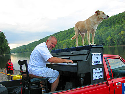 On the way back to where I am staying I treated myself to some musical improvisation. I drove to the waters edge at the Point Pleasant, PA tubing on the Delaware river. Dan the owner was there and I asked how many tubes it would take to float the Traveling Piano truck down the Delaware River. At first he thought I was crazy but then I got him thinking... "well, we do have a barge." I played music as a couple from Bridgeton, NJ paddled their way around the rivers bend to find us on the beach. What a feast for the senses to feel and smell the air while watching strong clouds in the sky above with the sun setting on bright green hills of trees. I could see the river as a canyon with its water smooth and almost still. At the same time I was adding to the experience for others by creating unexpected musical spontaneity. It was an easy mellow yet intense earthly surprise with the Traveling Piano's music, Boner and Myself.