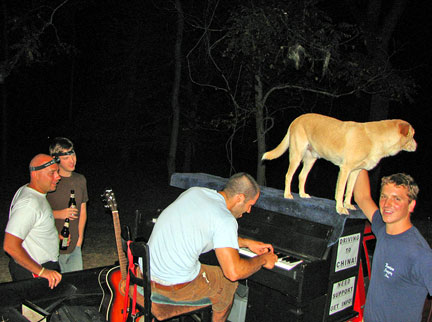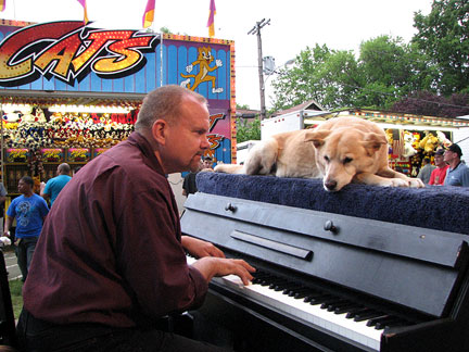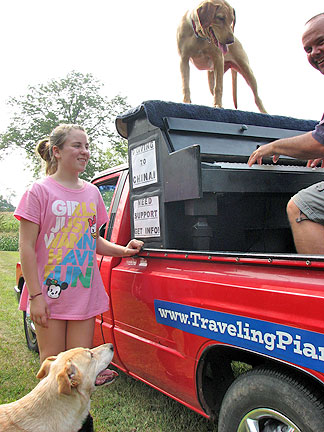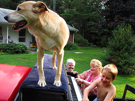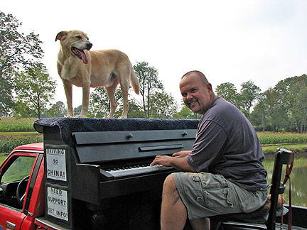 I drove the Traveling Piano truck to the pond embankment and played on the hill. Bo would not come with me. He was preoccupied with the hot dogs being used as bait for fishing with the farm visitors so I took Charlie's six and a half month old pup Tilly and put her up on the piano. It was Tilly's first try and she did great! She had plenty of incentive to behave and do a good job. Finally! She was getting the upper hand with Boner! It did not take Bo long to come running, "get the hell off my perch"! Today was very humid. Makes moving to do anything real slow. I improvised for about an hour and went really crazy in my head thinking no one could hear it. Later at night a neighbor far away told Charlie she heard me playing.