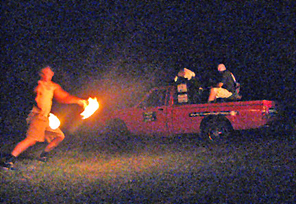 When I was creating music last night with my friend Tim fire spinning we talked a bit about our creating art together. Last week and tonight I fluttered between trying to capture our first experience... and also wanted to connect with my own individual personal experience now that I am more sure of myself and comfortable with that ...I also wanted to connect with what I was actually doing in the moment musically with Tim and also his girl friend Mary Beth's fire spinning a few nights ago. He reminded me how the first time I had a lot more changes and space in my musical breathing and this might have been because I was not sure of what I was doing, saying or trying to communicate, I had not yet found my voice back then. He was right! Now as I am finding my unique individual musical voice I must stay conscious and aware to not fall into the habit of only wanting to listen to myself. I must also stay with experimental random openness, not focus too much on clear communication, keep a balance and embrace the idea of mistakes, especially with other people.