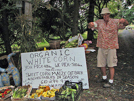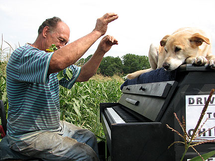 Down on the farm with the Traveling Piano... Henrietta the hen laid a three yoke egg today! That must have really hurt. I took a picture with two large eggs on each side of it. Wow! ... My friend Charlie has started a little farm stand at the end of the driveway for passersby. He puts a little "trust box" for people's money and loves to wave his dollar bills at the end of the day. When I purchased corn from him the other day I filled the box with $26 dollars worth of pennies, nickels, dimes and quarters that I had saved.