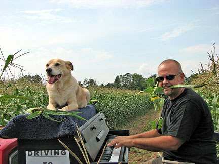 I need to become "still" and feel my way into knowingness but it seems to be a challenge to do this. Moment by moment I move forward. I pulled Charlie off his tractor today for a trip into the corn fields with Boner. We headed for some musical fun. I've been really enjoying have a friend to act stupid with. Time was spent calling and emailing a few leads to transport the Traveling Piano truck to China this week to the tune of possibly $40,000? Hmmm... that might be a problem.