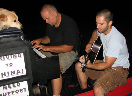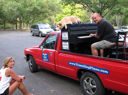 The last thing I thought I'd do is play music today. I cleaned most of the day and planned to watch the Olympic closing on television. Charlie decided to have a small oyster and corn roast. He invited his son and family as well as some corn pickin' customers who happened by, so of course I pulled out the Traveling Piano and just about everyone had a turn on it. I'm disappointed, sad about not having made it to China with Boner and the Traveling Piano in time for the Olympics. I missed my goal. Mucho energy was spent trying to achieve that success. The Olympics were the catalyst to sell my house and let go of my possessions. God, I tried so hard to raise funding and enough support! Good thing I have a lot of natural tenacity because that quality of self is the only energy helping to propel me forward, that and the support people have given to me thus far. I am not sure how to move forward, what to do. I still need practice with patience for myself. Do I need to redefine, hone in on or shift my focus? How do I not get stuck in a rut? Is this one-on-one intimacy what will be for the rest of my Traveling Piano time? Should I start driving across country to China or stay here and create the journey. I'm still going to China although it feels like I can drop that desire on a dime. I remind myself that my feelings are not always facts. As the ceremonies began, every time I allowed myself to feel sadness I started to break down and cry. I went to get a toothpick from my bag and I accidentally turned on my tape recorder. It said what I was repeating out loud with Tyler over and over the other day. I don't remember recording it. "Stay in the moment and feel good". Hmmm. My old ways of creating unnecessary drama are always laying just below my surface of consciousness.