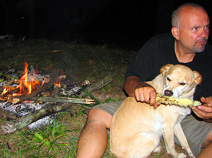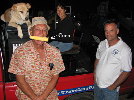 Today was a day to lay low. I took it real easy... took a nap mid-day, cleaned the truck, worked to get ready to go to New York tomorrow, watched Michael Phelps do his thing at the Olympics on television (a very inspirational moment for me), spent some time "believing" in possibilities, created music outside just Bo and I for about an hour ... and then as I was about to call it a night four guys, two sons of a friend who came to the Traveling Piano sendoff last month stopped into Charlie's farm to camp overnight, listen to music and roast corn over a fire. Boner has his first taste of corn on the cob with the full august moon shining bright in the sky.