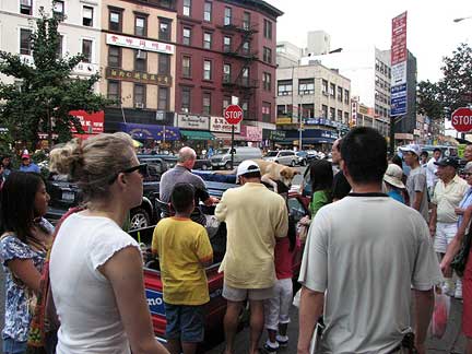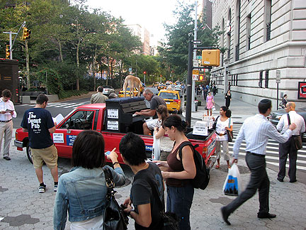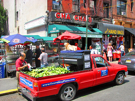 I drove to New York cities' Chinatown today to use up my promotional material and find a miracle transport to China in time before the Olympics end. The entire way I practiced focusing on being in the moment and feeling good. I wanted for the day to take me for a ride. It did. I was carried through and cared for in typical Traveling Piano fashion. I found a spot in Chinatown near Lafayette street. There was allot of foot traffic. I parked by the curb. As I tired to re-adjust the parking angle of the car it died. No power. I thought, "well I guess this is the spot I'm supposed to be in, might as well do what I came here for, create some music, I'll deal with the truck problem later when I need to." After about two hours the police showed up to clear the lane for traffic. "I can't move the truck officer, its dead." I showed her by trying to turn on the dead battery. She says, "well I guess there is nothing we can do then, the truck will have to stay." I became a feature on the street being the only vehicle. The only downer is that we were parked in front of a smelly fish store. After three hours, commotion arrived with a fire engine and other official vehicles. The cop comes running up to me with attitude, "get this thing outta here right now." I said, I can't officer, its broken down. He says "do what you need to do and get outta here now!" He parked his vehicle behind me and left. I went to turn the key, the truck started and I thought, "I guess its time to go."