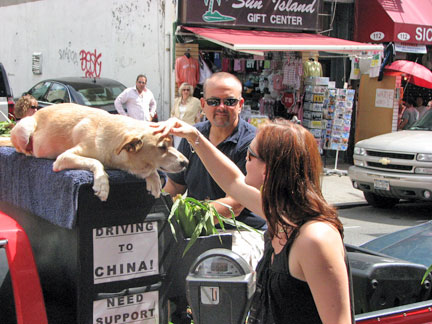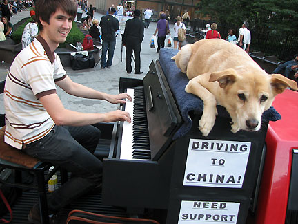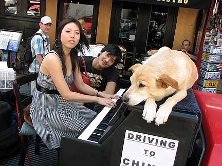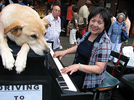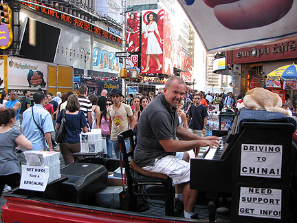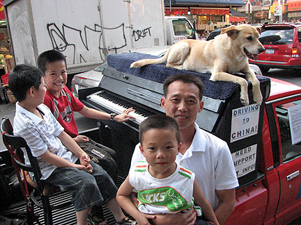 I drove to another Chinese neighborhood on East Broadway. Every corner had hundreds of people waiting for buses. Seeing as everyone was a local it gave me my first feel of what China might be like. Out of thousands I ran into only three other people who were not Chinese and most did not understand English. This period of time was different from the first in that I began to interact personally with people. Guys living on the street especially grab onto the Traveling Piano truck and specifically to Boner. I embrace them always, for a time but then I usually disappoint because they latch on so no one else can enter into any connection. After about ten minutes, I try as delicately as I can to move others who are waiting to greet us into the situation and the guys usually leave feeling rejected. One lady (not homeless) got onto the piano to play. She was so happy, "Oh this is my luck day, this is my lucky day!" she said with joyful anticipation of her daughter in China seeing her picture from this blog. I thought, "you need to keep conscious Danny, the reality that the world is meeting Boner, this part of your dreams, this goal is being accomplished via the internet, with all the tourists in New York if not at the Olympics."