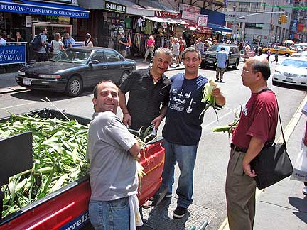 On the way, I stopped and purchased some gas. The pump attendant asked if he could have some corn and I happily gave him three ears. I saw him sneak an extra husk from the truck bed when I went to use the bathroom. It pisses me off when people do stuff like this but I let it go. Once I reached my destination bedlam broke loose. People on the street began to swarm the truck. When Jimmy found us and realized what was going he dived into a fresh ear of corn to eat right on the spot. Encouraging his friends and employees to teat some fresh corn followed." I was lost walking through a cornfield once and really hungry when I discovered how good uncooked corn can taste", he says. Fellow store owners, friends and employees began to appear, "everyone take some', he yells, and to those asking, how much to purchase, "two ears for a dollar, three ears for a dollar" and then... "Take a bag to the priests in the church next door!" Someone filled a big black bag for his mother, family and neighbors at home. The truck was emptied in less than ten minutes. I heard someone say, "this is certainly a first, nobody's ever seen anything like this before on Mulberry Street before!" After it was done Jimmy says, "here Danny, I made forty bucks you get half the take". I've been learning to take whatever money people give to me no matter what, so I took it to give to Charlie to add to his payment.
