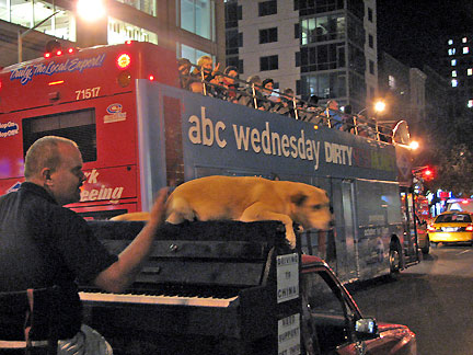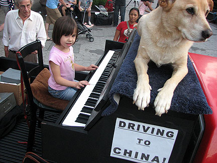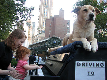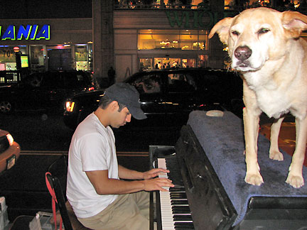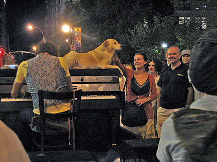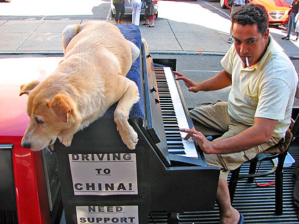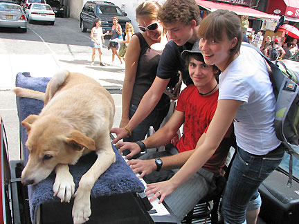 The Traveling Piano truck became a safe arena, a stage for musical experimentalists, amateurs, students, hobbyists, and pros to become adventurous together, explore their potential and courage to perform in public or to simply have the experience of playing a piano on the back of a pickup truck with a wonderful dog sitting on top outside on 14th street in the center of New York City! Aside from the beginning corn segment of the day, I had two personal moments of exceptional joy. A young guy from Toronto, Canada got onto the piano and started to improvise pure unabashed musical fun. He was great. He musically exemplified fully in mind, body and spirit the Traveling Piano's playful and experimental intent. Towards the end, after I improvised for a time a young guy asked if he could get up and play and he continued the same line and feel of improvising that I had just finished. It was not so much the notes but the energy and place from where his music was coming from was almost identical to mine. It was awesome. He had listened and learned the spirit of my creativity, took it... connected to it... and created it for himself. Awesome, it was awesome! Today, I began learning from people who play on the Traveling Piano. I began to experience new ideas, approaches to life, ways of thinking musically and otherwise. Today I realized that I must stay exposed to and open to people functioning on different levels of creativity and intelligence and from different backgrounds. What better place to find this than in New York City?