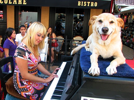 Union Square was packed with people. I parked the Traveling Piano right on the street in front of an ice cream truck that buffered the traffic flying by. The energy was too intense, the piano sound was drowned from traffic, I was afraid of getting chased away from police, most of the people were pre-occupied with performers on the square. It was a definite performance situation. I am not really into performance (showy) situations anymore but I went with the flow and began to ebb and flow between improvisation, Ragtime and Boogie Woogie music. I performed the Boogie Bumble, which I had not played in eons because I lost the ability the energy needed to perform the piece. I used the energy of the environment to help. I played it a little bit sloppy but I did get through it. After the other acts on the square began to break up then the crowd began to gravitate in my direction which was when the feeling of presence turned. I began interacting personally with people, telling them to come up and say hello to Boner. A bunch of guys began jumping up onto the piano to play. It got to the point where I was coaching people to ask whomever was playing... "Can I please have a turn now?" Hahaha... it was so great, and funny, and fun!
