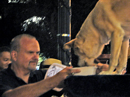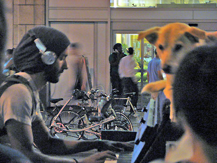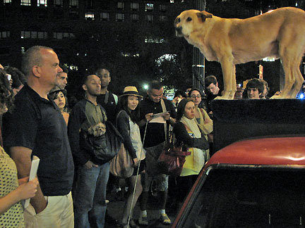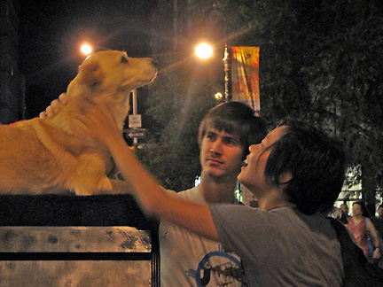 A park guard stopped by and I improvised her away. I didn't look at her but focused on soothing her concerns until she had no choice but to turn a blind eye. That was fun. People were enjoying the experience, the music enhanced the environment. I keep fighting a tendency to perform and impress in New York. My improvisation was way low key because I was way "low tired" all day. Still I kept the focus on my mission, fun friendship, respect.... musical inspiration and empowerment. One girl told me she was inspired to pick out a park tomorrow where she would go and just sing accapella for the fun of it. I met two like spirits Diane and Andy who took me for dinner at the end of the night. Boner was covered with perfume from all the New York ladies giving him constant petting and kissing attention.