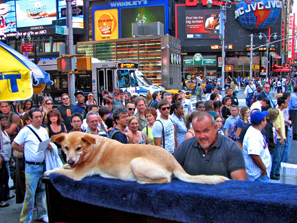 To keep our energy up Ty and I started to focus on "lets find a place to have fun, feel good, create feeling of anticipation, the feeling of what happened in New York on Tuesday. We kept saying it out loud while we drove around not being able to feel our way into a spot and then we ended up in Times Square. We were able to create music take pictures and play for about ten minutes before we must have shown up on the homeland security camera's. "Alien... Alien in Times Square"!!! The cops came and chased us. Talk about scads of people, wow... its been awhile since I have been in such large crowds.