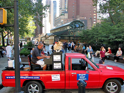 I was on the street all day and night. People, tourists from all over the world met Boner. My friend Brad stopped by, my goddaughter Alisha found me by accident on the street. I ran into my dear, dear friend Stephen's old roommate, Tyler. How amazing to hook up with so many people that I know two hours away from where I am staying and in a city with millions of people? We all hung out at the Focolare Bar & Bistro. Jimmy comped meals for everyone. When it felt time to leave Little Italy I was really tired and was thinking bout getting back to Pipersville. Once again as on Sunday I pushed myself to continue. I wanted to make as much use as possible with the Traveling Piano and the opportunity for people to meet Boner. Alisha, Tyler, Boner and I jumped into the truck cab and drove off to Battery Park. I played there for a short while, nothing was really happening and I was quickly losing what oomph I had. I needed some energy to bounce with, so we headed for Union Square.