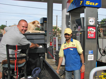 I stopped at the gas station where I've been giving my business for 25 years and had some fun with the Traveling Piano. The 16 year old guy pumping the gas asked me to play some music offering me five bucks and I said sure! His cousin Tom (part owner) and the guy who purchased my house, who I am waiting to purchase my second truck, who said he'd make a contribution to the journey, who I gave my bicycle to, and who took some corn and zucchini from the truck wether I wanted him to or not... I got him on the truck to play a few notes and then got back on myself saying I was not going to stop playing until he gave me a tank of gas. It did not work so I took the Traveling Piano truck down the street and filled it up with gas at his rival station at .12 cents a gallon less. Then I got a picture of the owner filling it to send to Tom. Ha, what fun that was until my karma hit me in the face because if I had waited until I got to NJ to fill the tank as planned I found out I would have paid .62 cents a gallon less! Ouch...ouch...ouch.