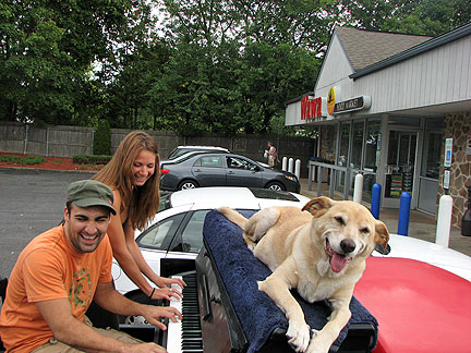I only had about six hours sleep so while driving around today I stopped at a Wawa convenience store for some coffee when a really cool couple pulled up along side of the Traveling Piano truck in their jeep. "So what's this about? It was a guy who is a DJ, has done music marketing and is starting up a travel tour company. We all did the Traveling Piano "thing" right there on the spot and after that the last thing I needed was coffee!!! I am so looking forward to meeting more and more cool people. Water seeks its level :) ...and I know what's going to happen from experience. I love this life! My friend Cindy is really into supporting me by allowing my time to flow with hanging out and being late, treating me to dinners to save my money, offering me her plce to stay in... all very much appreciated. When we got back to the farm, oh my... Boner was happy to be! He has already adapted the place as his new home, won't be for long...