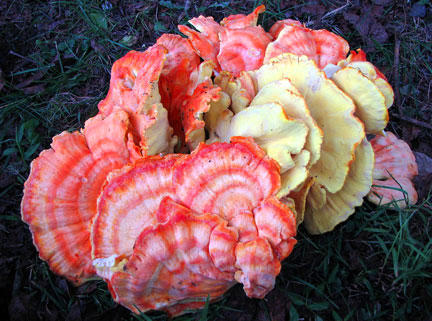 I was taking Boner for a walk and found a ton of Chicken Mushroom growing on an old dead tree trunk along the road. Yum, Yum, Yum!!! What a rare find. I brought it all home in a large box. It has a most beautiful deep orange and white color, the texture and taste is like chicken although you would never know because I used way too much hot sauce when I cooked it. Charlie tried to use corn to bring down the spicy taste. Can't buy this stuff, and almost impossible to find, what a lucky man I am.