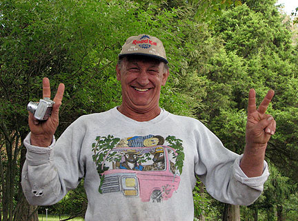 Todays picture is what Charlie looks like tomorrow as I am leaving, V's for victory. A vision of the future because it certainly is not in the present moment of happening today, my leaving. Are the V's for me finally getting outta here from the farm or... success in beginning the next leg of the journey. Hmmm... probably a little of both. I woke up with an allergy headache from Bo's dander then my Megellan roadmate arrived then my computer began to give me troubles... I refuse to rush so I'm not leaving today. Charlie, I am attracted to him through love, nothing physical in spirit only. He is the example of someone manifesting a life, his life with love. When things happen that could be considered bad Charlie just lives with them and through them with a decision to move, with love. Pretty cool...