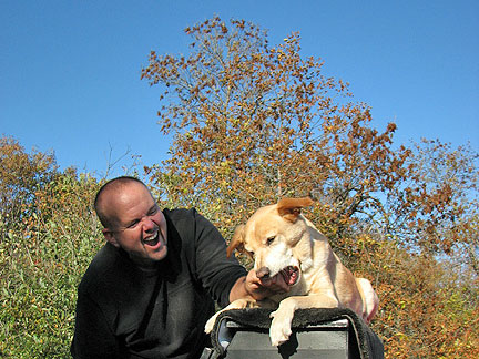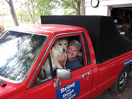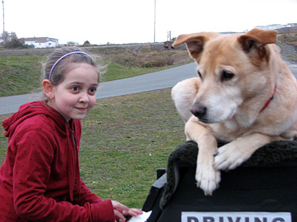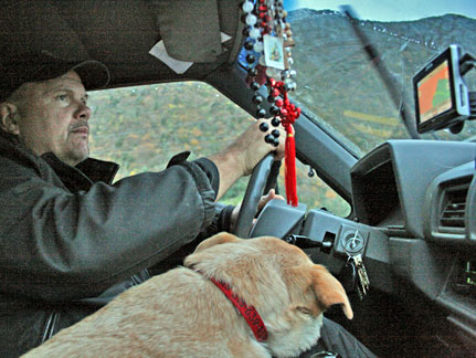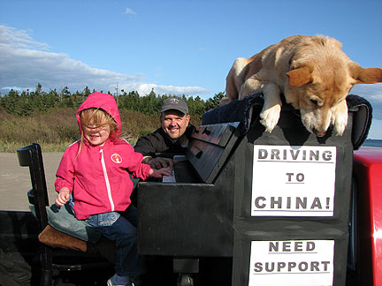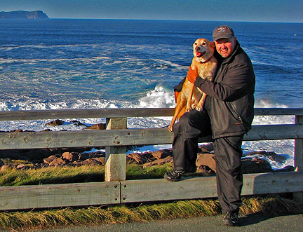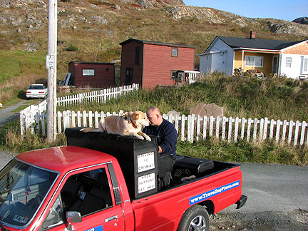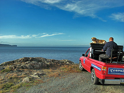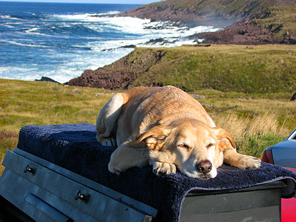 Coming off the boat into Newfoundland I was a little seasick, Boner was also but not too much. It stormed big time all night. At the end the boat swayed enough that I had to move from wall to wall through the corridors. Boner has been excellent through everything. He goes with a flow of trust and love. He knows I will help him along and will return when I need to leave him in the cab of the truck, his den. His main desire even above food is to be with me. I am really glad I brought his security bed blanket with us. It is an anchor for him.