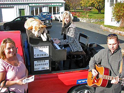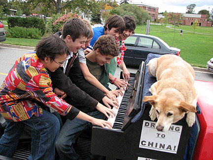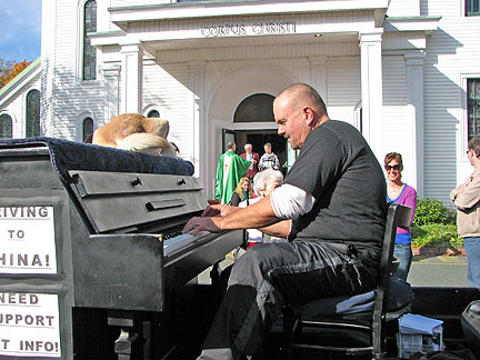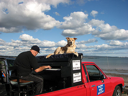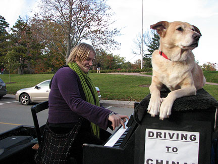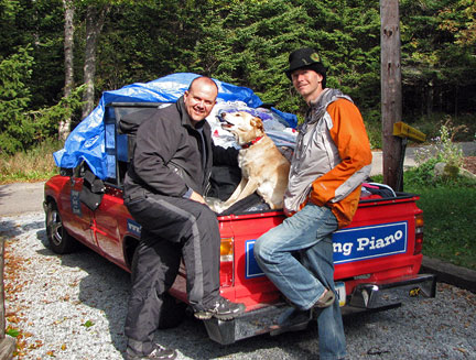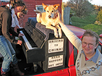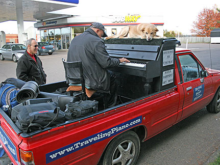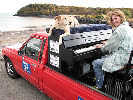 Did it! Said goodbye. Lets see what will happen. I started for St John, New Brunswick Canada. First stop, my friend Cor's house to drop off a huge truckload of clothing material for his Stitch Uganda Together project. There is more info about that on the last day of September's blog. The Traveling Piano is heading for its third country. After America and Mexico now its Canada. Bo says, "I'm not sure what is going on but as long as I'm with my partner I'm happy." I decided to drive straight through because I can't create any music with a truck full of dresses and I knew stopping off in different towns over a period of two or three days without playing the piano would drive me more crazy than a fifteen hour drive. The welcome center in Massachusetts, a random gas station where a musical band was transferring equipment in New Hampshire and the customs officers at the boarder, these situations had all presented themselves as opportunities to play music. Damm.