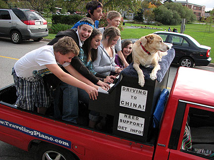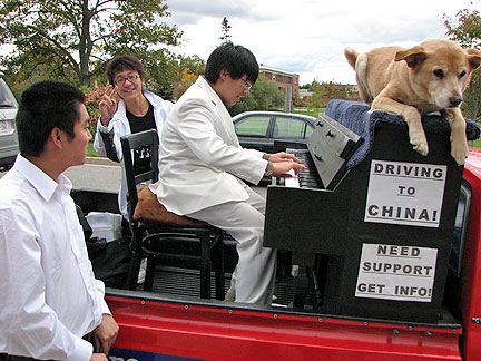 Today is election day in Canada as everyone picks the equivalent to the American president. I drove off into town to see what I could find. I stopped and parked the Traveling Piano truck on the street along a beautiful pond and heard piano music coming from the building next door. It was a college music conservatory. I ran inside the building to convince piano players who were practicing to come outside and play on the truck. It was a beautiful warm day. The first guy I asked would not take me up on the offer and was clearly not interested. It blew up my bubble of enthusiasm. I went outside reminding myself not to push any agenda. I saw what looked like a spot on the top of a hill behind the pond and decided to drive up there to create some improvisational music just for myself. There was a group of about 12 people from Korea nearby so I told them what was about to happen and invited them to come up once I was set up. It was a perfect spot. A young Korean girl about twelve years old began to play better than me! Her six year old brother was amazing also. Slowly but surely people would discover and ease there way towards us. Sometimes I had to wave my hand to signal that they were welcome and desired. Apparently, because of where I was situated the music could be heard all over town and people found it pleasing. Thank God!