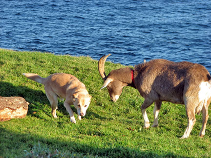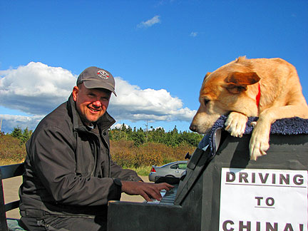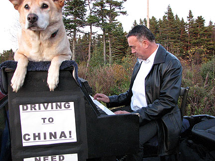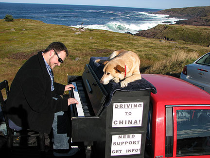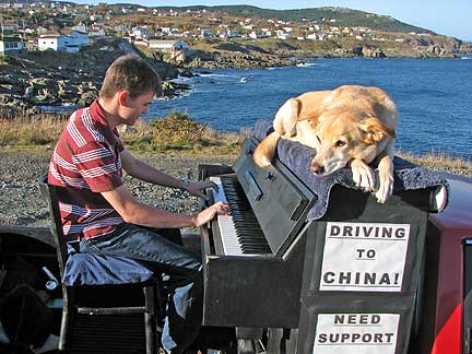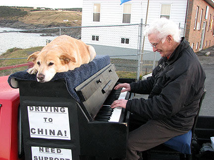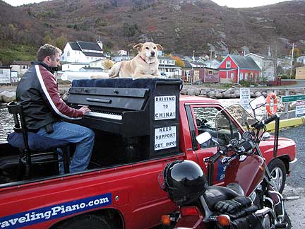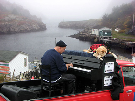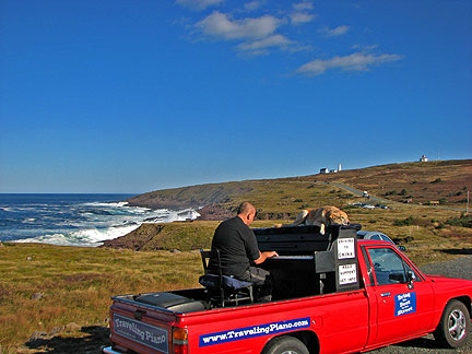 Dan the president of the Newfoundland and Labrador Musician's Association found us. I happened to have stopped the truck a few blocks from his home. Its not like this is a small area of country in Canada to easily run into the people I have been meeting. St.John's alone has more than 100,000 people in it. I drove to Dan's next door neighbor Elke's house for what turned out to be a real afternoon Newfoundland Kitchen Party. Dan played the fiddle with his son by his side, we had a short jam session and then went inside for pumpkin pie and tea with three woofers from Germany (workers on organic farms) Stephanie, Else and Nina. The yellow house had a front yard with a grassy plot on a cliff next to a red barn overlooking the ocean. There were goats hanging out on top of red tables, yellow Adirondack chairs, chickens, birds, cats walking on the roof, dogs... the bluest ocean... this was heaven. Boner has been interacting with many types of animals for the first time. He's into it. I am living my dream to connect with strangers as friends, to be embraced in fun, friendship and respect. Driving on the way out of town a guy yelled out to the road as I passed a lookout point. "This is a great spot to pull into," he yelled. I do not think he even saw the piano; he was just looking to connect with someone. How could I resist? I ended up experiencing more glee from this 80 year old gent than I have ever experienced from another human being to date, more than any child I have seen. He was completely enthralled with the music and the whole concept from beginning to end. Having never played a piano before he jumped up into the truck and banged away for like five minutes, like a child exploring with totally uninhibited fun. While I watched him I thought, "I love being the center of attention and to be part of big events and get paid big bucks for my work, but I love this type of experience better."