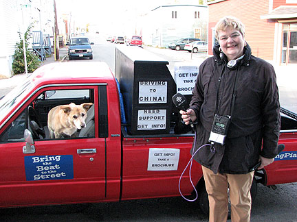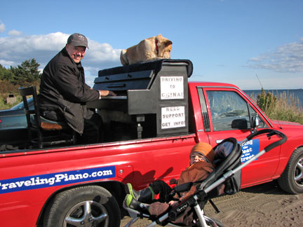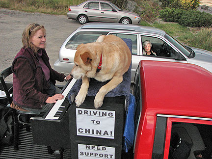 Even though it was a bit chilly I met many people and they had turns at the piano. Brenda was so much fun with her pup in the Traveling Piano truck, I'm pretty sure it was a schnauzer. Boner was very congenial. Boner really helped another woman with his dog therapy skills. As they comforted each other she told me how she was missing her dogs and that she had come to this spot to write a farewell note to her father who was passing at any hour now. She was going to let the music help her to write the letter. Another couple sat for a good long while in their car and worked on the business work of their ministry. They stopped by before they left to give me a copy of the Watchtower. (Jehovah's Witnesses) A really fun nordic woman named Iris stopped with her son in a stroller and told me about Iceland's national bankruptcy issues from the news today. I'm glad I do not have a television in the Traveling Piano truck. When I hear about all this world financial stuff it makes me want to get what money I have out of the bank and go hide it under a rock for safe keeping. The woman took the trouble to drive home and come back with a financial contribution for the journey. Appreciation like that goes a long way!