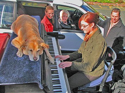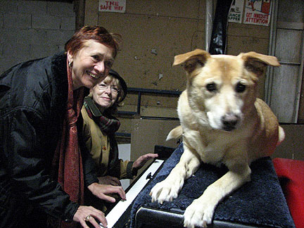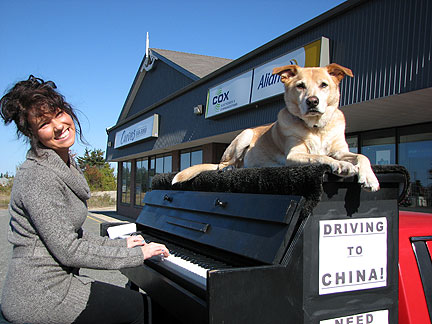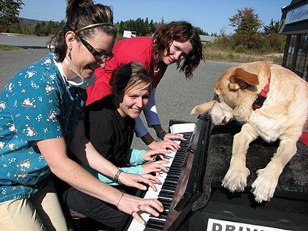 The sun came out today and i was ready for it even though Bo needed his coat by the end of the day. Orinda my host, the hostest with the mostest, who has never had a dog in her house before, and who has been won over by Boner, had made a call to the CBC. Suzanne from the St. John's Morning Show called as a result and asked if she could ride around with me to record how the Traveling Piano works. She was a lot of fun and worked hard to keep her mouth zipped so I could create a flow. I worked hard to be natural with a big fat mike in front of me while I drove and talked. Boner worked hard in all ways as usual. Everything went on record! I began by showing up unannounced at the station so everyone could discover us and the televsion guys came to do a spot also.