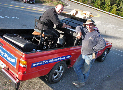 This part of the adventure was harrowing. In all its twenty one years, the Traveling Piano was never put through such a test with the elements. The entire way it rained. The tarp that covers the piano was given the ultimate test some eighteen years after it was custom made for the truck. Rain pounded, wind blew... the tarp was stretched in every way to the limits. I tried to think positive thoughts like, "good thing it isn't snowing" which was ridiculous because I'd be going nowhere if it were snowing. The last two hours... the last two hours... I focused completely to keep the truck from blowing off the road up and down and around amazing mountains and turns with continuous gale force winds. I could see nothing, it was completely dark with hurricane like rain. For two hours, the rain blew completely sideways. I could see no guides like a mountain on the side of the road to tell me I would not I would drive off the road into nowhere land. The road was a pure mirage of swirling water. I hydroplaned the truck a good eighty percent of the time. I could only go 40 miles an hour at times and when big trucks passed, ugh! Water was splashing over the front hood. I knew at one point the ocean was on both sides but I could not see it. The wind was so strong it blew snaps off the sides of the truck so they flapped with all the water soaking the contents. I tried to resnap them but the wind was too strong to keep it on.