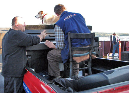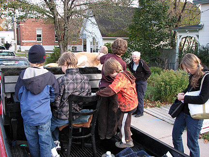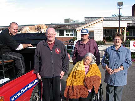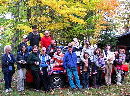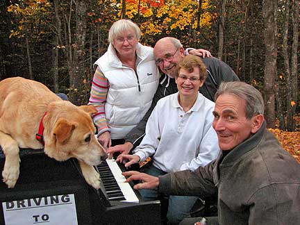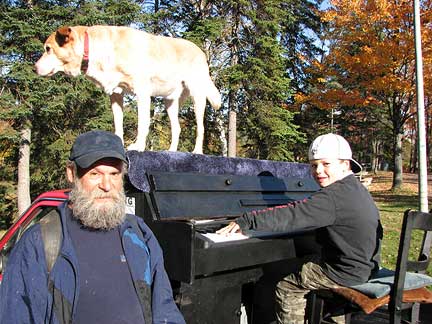 There were about twenty-five people at the family dinner and we all celebrated along with some Traveling Piano music. As I performed Scott Joplin's Maple Leaf Rag, a guy named Toby picked up a maple leaf from the ground and gve it to me. Canada's national flag is also known as the Maple Leaf. We all got into a picture with the Traveling Piano while I held the Maple Leaf. This was a real feel good Thanksgiving and I was grateful that this family would share their friendship and respect with me. At night the men went to "throw some wood" ...as in fill up the trucks with winter firewood to take back to the city. I got out of the work by providing some "throw wood" piano music to speed the time along it's way. I thought about how I used to get out of doing the dishes as a kid. After diner was a convenient time for me to practice the piano, when the dishes had to be done. I'm no dummy.