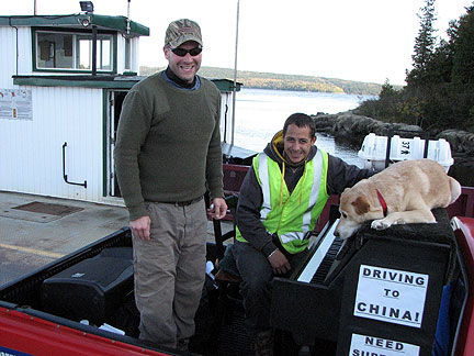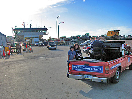 We kept driving on and found a small fully open beach, pulled onto it and I created music while watching Alison dance at the waters edge. She also had a turn at the piano. The weather was perfect. Onward... we found a ferry, a free ferry! It costs .50 every time I drive on the highway but the ferry is free both ways? Great. I performed my improvisation on the water for the first time. Oh, it was so wonderful. The people in the cars, people came out of the cars, everyone including myself we were all in awe. It was such a short time only minutes but that made it even better. I've done drive-by-piano-in' before; today I did some float-by-piano-in'.