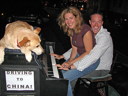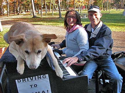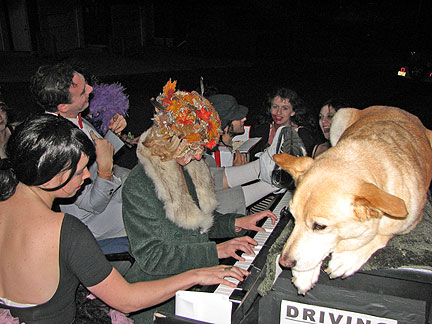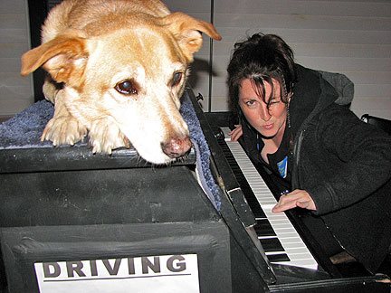About 11PM at night I got a call from the bikers I had met the day before on Signal Hill. "Hey man, can you come bring some music to our party? Darrin and Tracy gave up their Saturday night together to drive me out to an area called Paradise. Darrin drove the Traveling Piano up the street with me wailing away the Boogie Woogie with Bo on top of the piano while Tracy shot pictures of... ha...ha...ha... about 40 drunk screaming kids in the middle of a typical suburbia housing development street. It all lasted about five minutes and we drove away just in time because Tracy said she had seen "mom" running out the front door... "don't do this to me the cops were already here once!" God, that was fun.