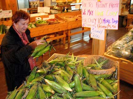 It's snowing! I love snow. This is a wet snow, no accumulation. The Traveling Piano truck is tucked safely away in a warehouse. I went to visit it today for the first time since I arrived. Orinda my host with her long time friend Eva drove me. We spent a short time with the piano and some music. I really wanted to just create some music even if for a moment. I spent most of the day with these two ladies. We stopped at a farm market to buy some corn on the cob. I don't know why but if you have been reading this blog, corn has been a major part of it over the last few months. Huh? Anyway, they just figured out a few years ago how to grow corn here and now harvest it up to the frost. It is big, beautiful, tastily delicious!