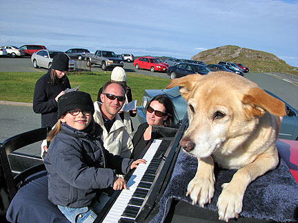 Cape Spear is the easternmost edge, tip, point in North America. I enjoy taking things to the edge and so I did that with the Traveling Piano today. This is so fantastic to visit large, dramatic and open scenery with the Travelling Piano and Bo. I have been different places around the world but now with my music and dog along... it is incredibly satisfying. The ocean waves crashed into the air with a look and feel of fireworks... big white fireworks against dark, tall, grey rock jutting into the sky with a blue ocean backdrop. The air was sunny and crisp, perfect for creating music.