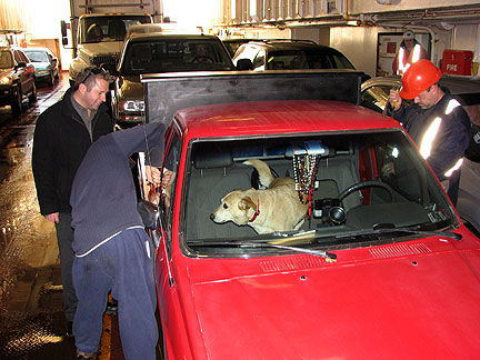 At the ferry window I played "sweet". I told them how I just drove up from Philadelphia blah, blah, blah... and then I propped Boner's head in my arm for them to see him. Boner saved the day. The boat was completely filled, there were major strings pulled, confusion, other people had to suffer. There is no exaggeration here, we were told to, "drive straight up the ramp, don't stop just drive up the ramp until your in." It was very confusing in the dark with barriers and do not enter signs, red blinking lights but I thought, "just follow direction." I drove up the only ramp I could see no matter what. In a matter of moments, I was on the ship telling the bewildered attendants that we told to "just drive up the ramp".