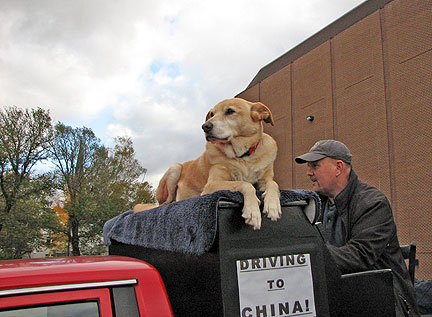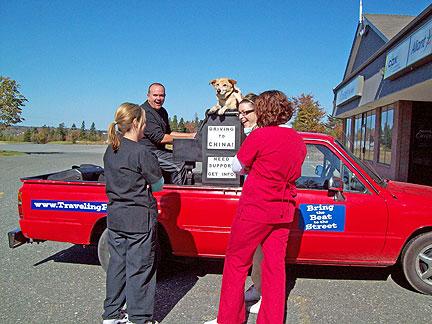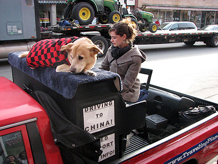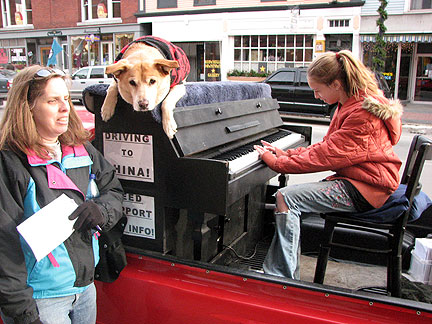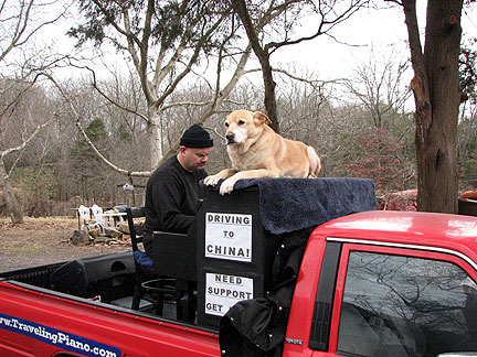 My friend Charlie went with me to look into new trucks for the Traveling Piano. After about an hour I was ready to pass out. I want this to feel like fun! Hmmm... Anyway, if I end up getting a different truck it cannot be too high from the ground, people need to be able to reach Bo. It must be red and have a truck bed of at least 7' long and a seat bench that Bo can stretch out on. Just that information alone knocks out most of the trucks that are on the market today. They just don't make them like they did over 20 years ago. Built in 1987, that is how old the present Traveling Piano truck is. Should I get a used truck, rebuild the present truck, buy a new one in China??? With the present state of affairs a new truck, piano setup and plane tickets will wipe out most of my funding from the sale of my house. Fact: for this whole year of 2008 which is almost over... seven people contributed to this journey via the website. Kazilla Yikes!!!