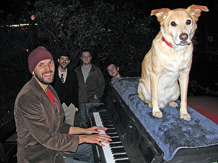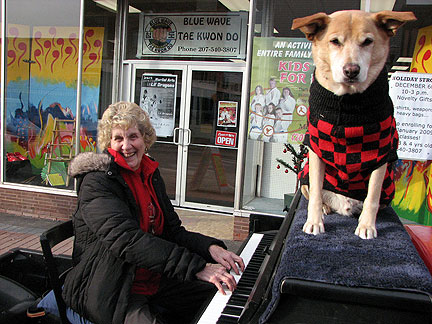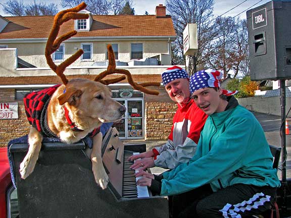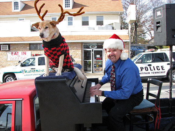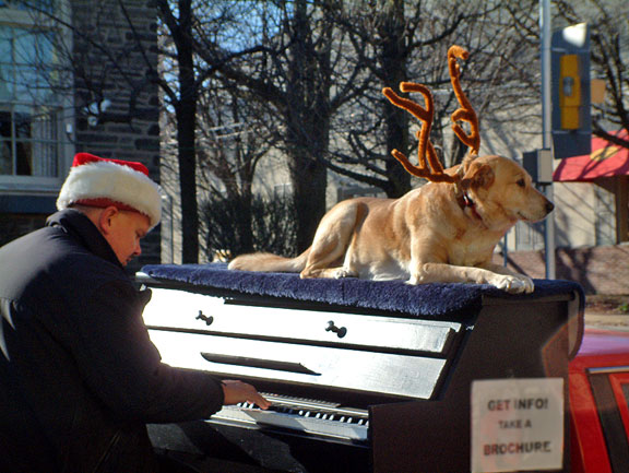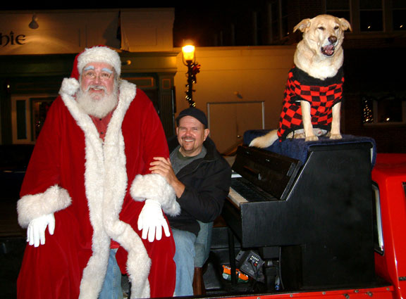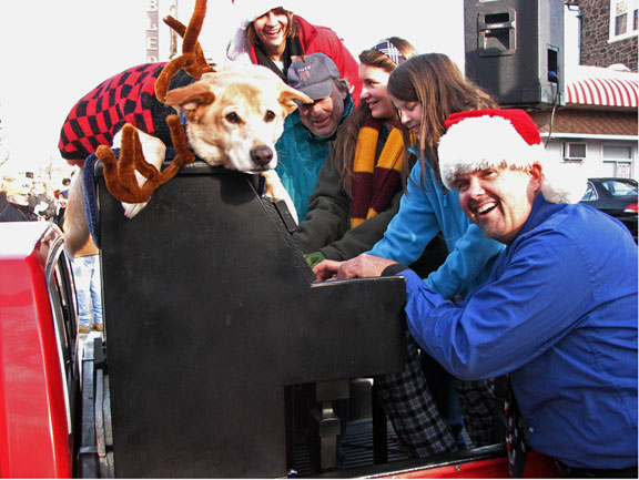 Boner has been such an incredibly wonderful life experience for me. Having a dog in my life, specifically Boner and he is my first.. is without question the best life experience I have had to date. The consistency of our relationship has been unparalleled. We both have been growing up together. I have had a lot of fun doing Christmas parades with Bo hanging out on top of the piano. His doing this with me sort of just happened. It was never planned and I never trained him to do it. Same with his reindeer ears. He just took to it. When I think about my playing the piano in Chestnut Hill, Pennsylvania a couple of years ago (todays picture) it feels like another life time. I am very grateful for this Traveling Piano life experience I have been having and for friends like my bud Charlie who has been sharing his home with me. I told him how much I appreciated his spirit tonight. This I think is very important to do (verbalize the words) and not often easy for me... I could get analytical on that subject big time but I won't.