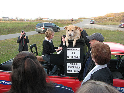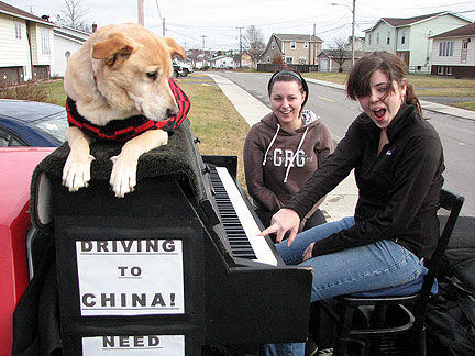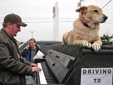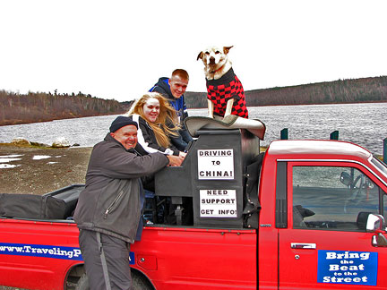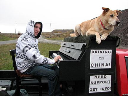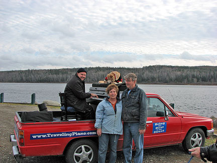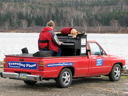 Piano Dog Boner and I have just returned from a two and a half month peregrinating musical exploration of Canada. The journey took us throughout New Brunswick and to the easternmost point of Newfoundland. After the sale of my home, there are still some belongings but now... no home in which to store them. We traveled to contribute an oversized truckload of clothing to friend Cory Richardson for his Stitch Uganda Together project. For info see... Stitch Uganda Together We met Cory down in the hurricane Katrina affected areas of the south in 2006 and again in the Mexican tribal village of Roblito in 2007. New friends provided eighty-five percent of the Canadian need for food and lodging. My personal out of pocket expenses topped $3000.00 (financed from the sale of my home). Fuel topped the list of expenses followed by truck and equipment repairs. In 2008 to date... seven people have contributed to the Traveling Piano website... total contributions $645.00. This is the link where you can contribute. Contribute!