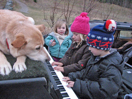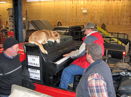 Amazingly enough for me it is December and I am still in Newfoundland, Canada. Not so amazingly, it is raining. Fairly amazingly, it is not snowing. I'm with a terrific family, like souls... we were drawn to each other, attracted to each other. I am blessed. Boner needs a good run and walk. Derek my host is owns the Stroud's Auto Repair and Salvage business here in town so he has been looking after the Traveling Piano truck for me. I can also thankfully park it out of the rain for a day as the cover's insulation is not holding as well as it used to. Zach, Derek's son jumped onto the piano for a bit, I showed off a song for Derek's brother who is a partner in the business and there is a piano in the house that I have been playing on and off all day. I love creating music on every piano I can find. Each piano presents a unique opportunity for a different approach to sound. I enjoy variety and possibilities. I want to get Boner into warmer weather...