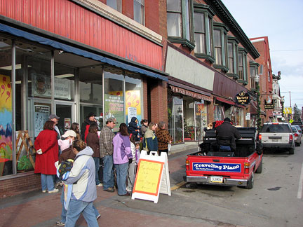 I'm now back in America and still finding new Canadian food dishes to eat. Dorothy my host cooked me some Ployes this morning. This is authentic French Acadian buckwheat pancakes, Yum! Afterwards, Chris and I drove to the town of Skowhegan where he was volunteering to help sell Christmas wreaths for a local community project. The fact that it was 32 degree weather did not bother me at all. It is bothering the truck and piano, everything is squeaking from being frozen. I say, "squeak away I ain't stoppin"! We had fun. Afterwards Chris showed me around his house. He is building an outside sauna made from cedar wood cut from his "wood lot". People own land here specifically to grow trees and to use the wood. He has a Bog Stream next to his house with the sound of rushing water where there was actually a saw mill in 1886. Thats pretty early in time for a saw mill!