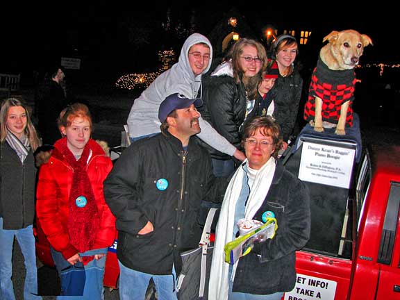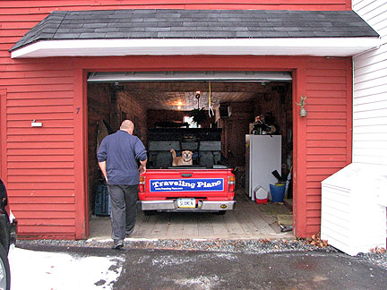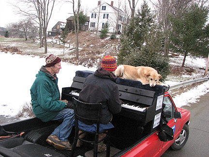 In the afternoon I headed across the street to Lee and Secha's place. They were hosting an annual family "Aunties Christmas Tea" get together. It was just a bunch of nice women from Maine :) I parked the truck outside and then ran inside to throw myself into the come together, told a bit of my story and then everyone trooped outside into the cold for a few songs and pictures... then off Boner and I flew across the street and back into the garage. Most of them already knew about the Traveling Piano because there was a big fat local section front page picture and article in today's Sunday paper from yesterday when we were playing in the town of Skowhegan.