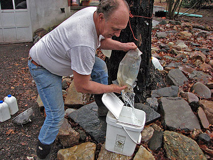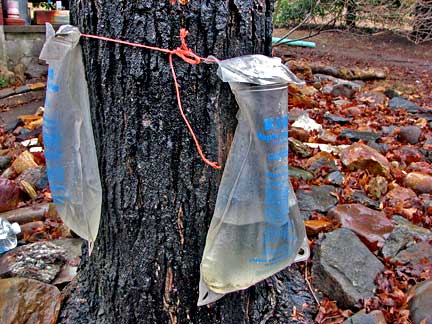 I took some pictures of my friend Charlie tapping maple trees everywhere on his property. He sticks metal taps into the wood with bags attached and then maple sap starts dripping out to fill plastic bags and containers. He saw that a local sapsucker bird was tapping one of his trees and then the sap running down the tree. Last year the trees started running sap in December. The norm is in February, March and April. This year it was even earlier... by two weeks. Charlie says nature is going topsy turvy. Anyway, it is all fascinating. The sap is like water slightly flavored with sugar. I drank a large glass of fresh maple sap today. He fills huge pots inside his house and on a wood burning stove they sit overnight until all the water evaporates and the consistency becomes maple syrup. It is literally over 100 degrees in the house right now. It takes forty to fifty gallons of sap to make one gallon of syrup. He already has 2 gallons of fresh, delicious, (very expensive in stores) homemade maple syrup! I am amazed that more people are not making there own maple syrup. It does not get healthier than this.
